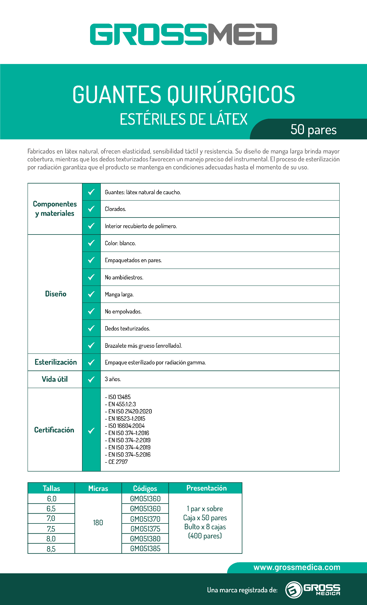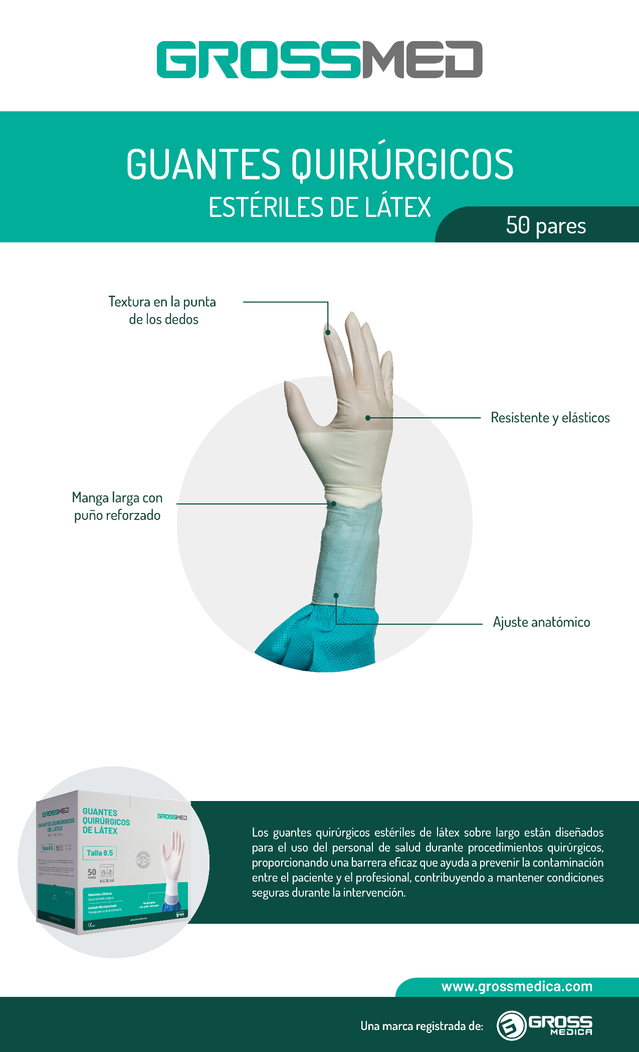 Guantes Quirúrgicos Estériles de Látex, Sin Polvo, Sobre Largo (Talla 6.0) - Caja x 50 Pares - GROSSMED