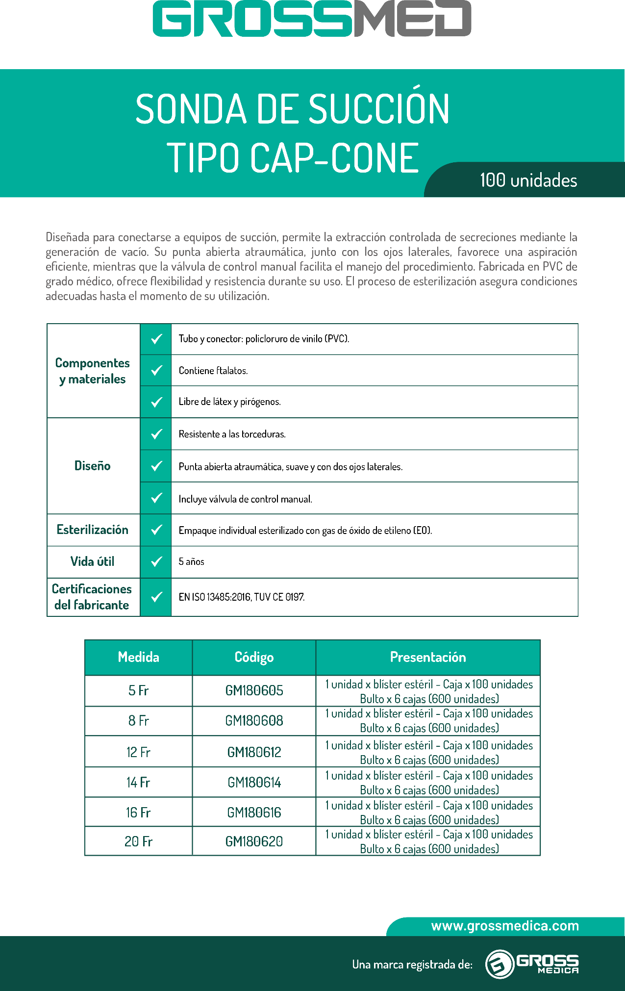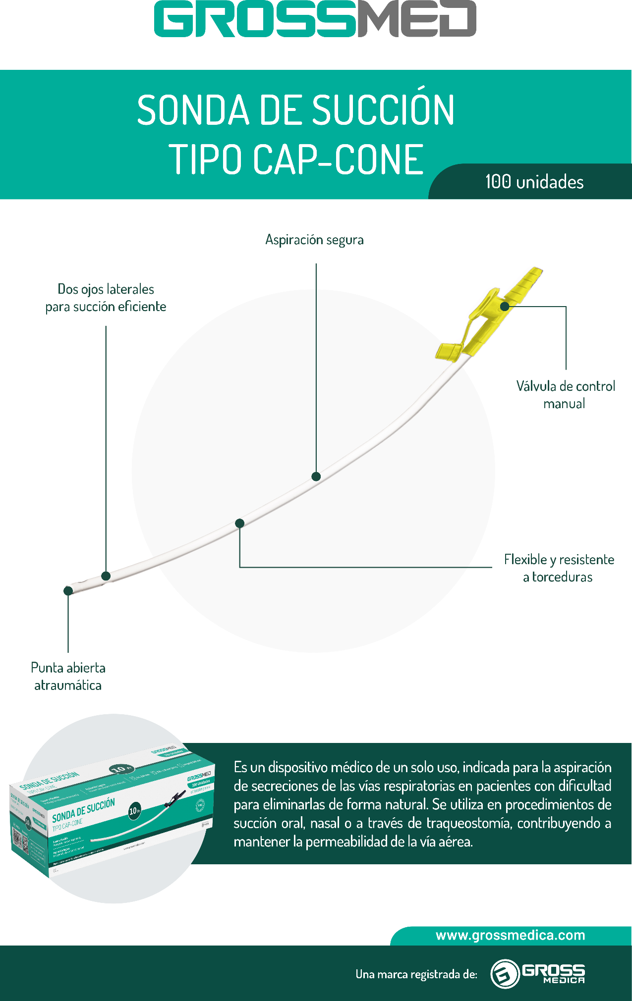 Sonda de Succión de PVC - Tipo Cap-Cone 20 Fr (E) - Caja x 100 Unidades - GROSSMED