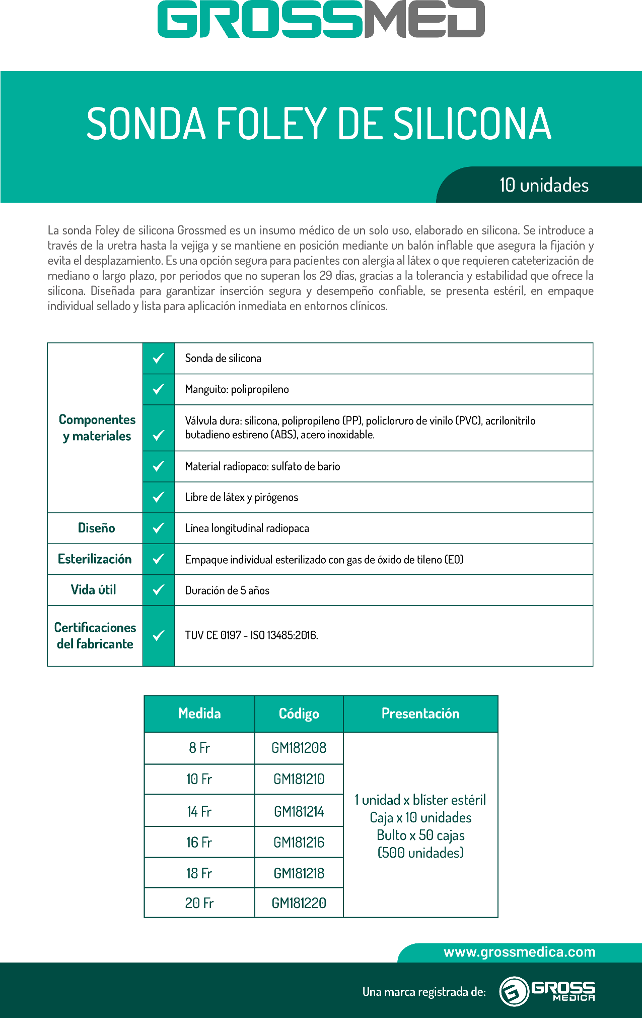 Sonda Foley de Silicona 2 Vías con Válvula de Plástico 8 Fr y Balón de 5 - 15 mL (E) - Caja x 10 Unidades - GROSSMED